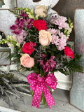 Look no further for the perfect statement piece than The Jessica! Colorful Stargazer lilies, gorgeous roses, and dainty mini carnations, cones together with a mix of beautiful greens. Feel the excitement of Jessica's aura with this stunning floral arrangement!