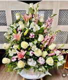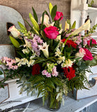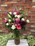 The Esme is the perfect bouquet for any occasion. With a beautiful combination of roses, hydrangeas, alstroemeria, wax flower, and larkspur, this arrangement comes in a basket and can be customized with a variety of colors. You can trust that only the freshest blooms will be used, although substitutions may occur. Show someone you care with The Esme.