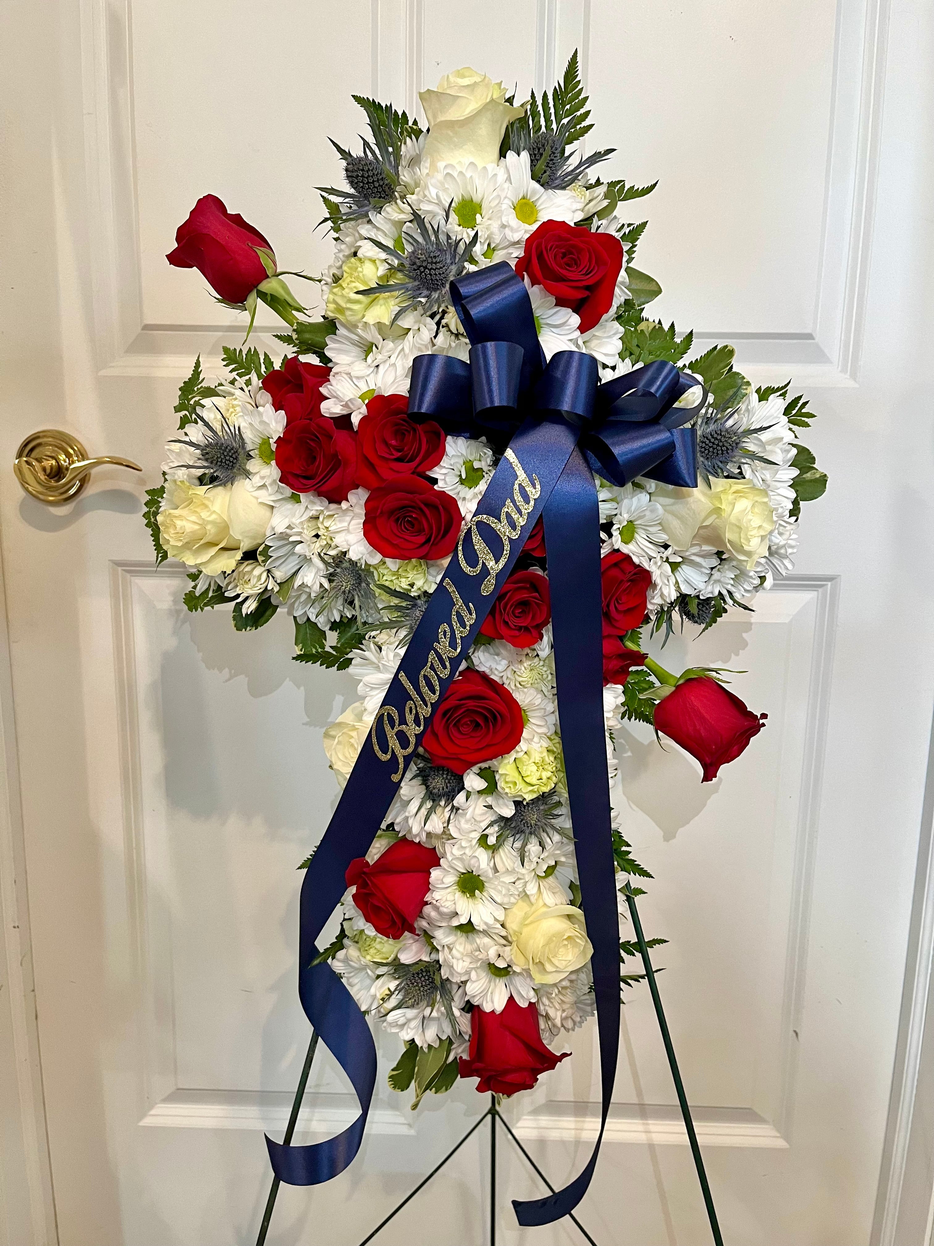 A glorious cross with red roses and a mix of white flowers, with just a hint of blue thistle, hydrangea and delphinium. At the Silver level, the cross is approximately 24" long, comes on a stand and to include memorial ribbon with two words of script. The Bronze is approximately a 20” cross.