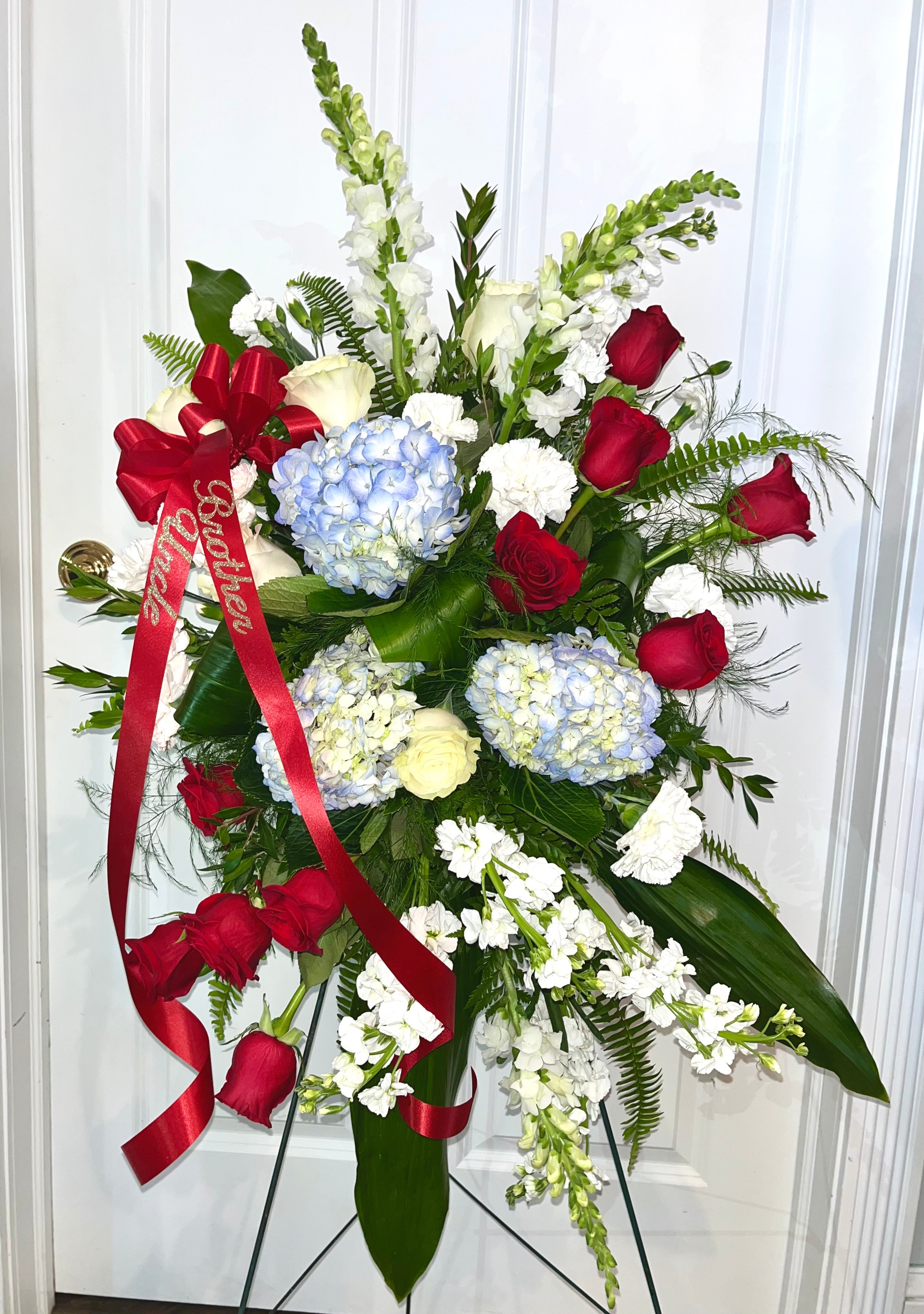 The Logan is traditionally made with white, yellow, and blue blues with a mix of greenery. Substitutions may occur.