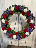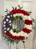 A patriotic design to honor those who have served, this wreath features red and white flowers with blue accents. Available in 3 sizes to suit your needs, all including a blue memorial ribbon (not shown) with 2 words of scripting of your choice. The Gold, is an 18in wreath. The Silver, is a 15in wreath, and Bronze, our smallest version, is a 12in. diameter. All sizes will be presented on an easel stand. If you love The Patriot but would prefer it in another color scheme? We can do that as well! Put in the design notes your color ideas or give us a call!